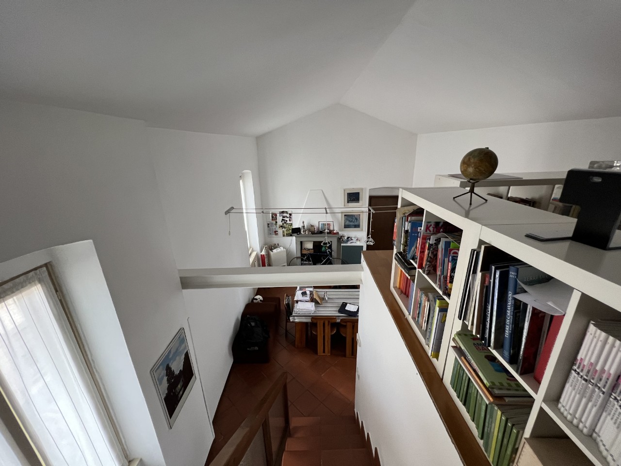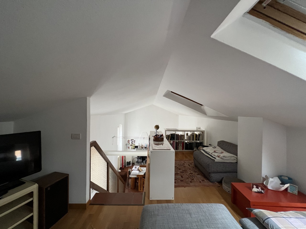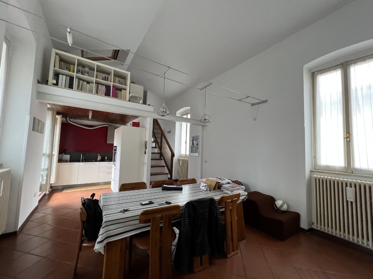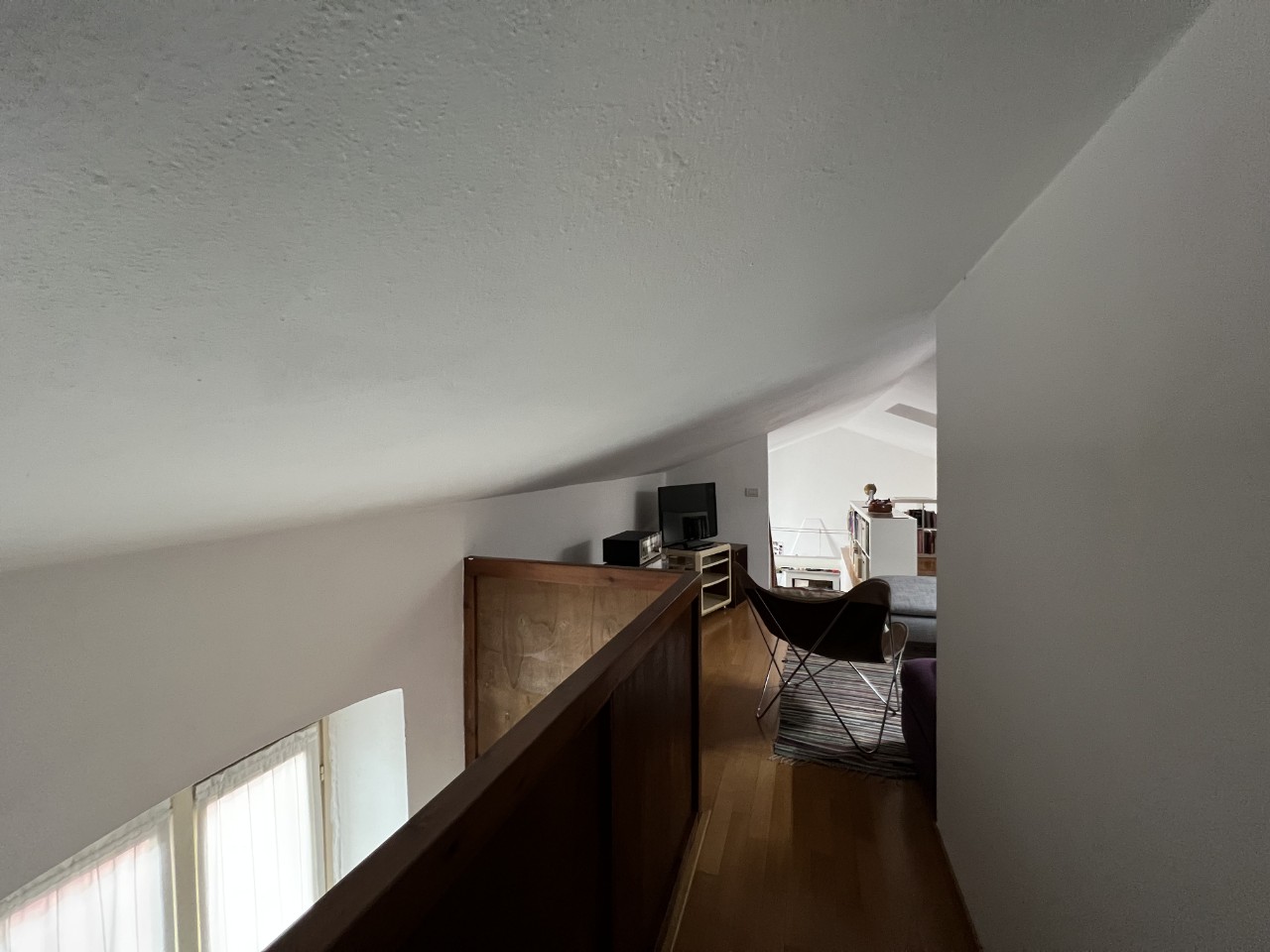 ingresso, angolo cottura con ampia zona pranzo e sul soppalco soggiorno con ripostiglio, camera matrimoniale, camera singola, bagno finestrato con doccia, balcone. Mq. 90
