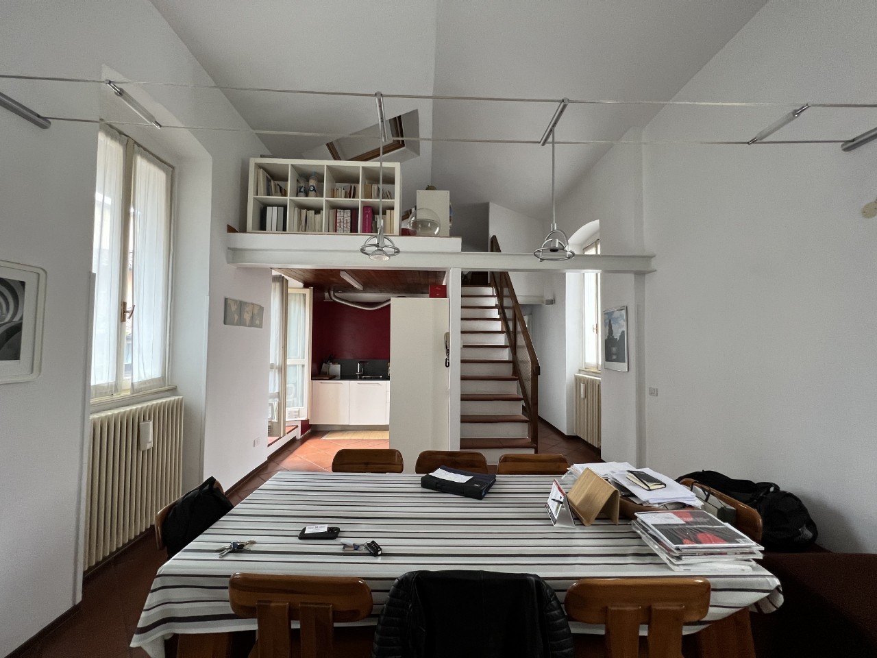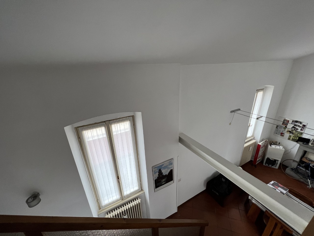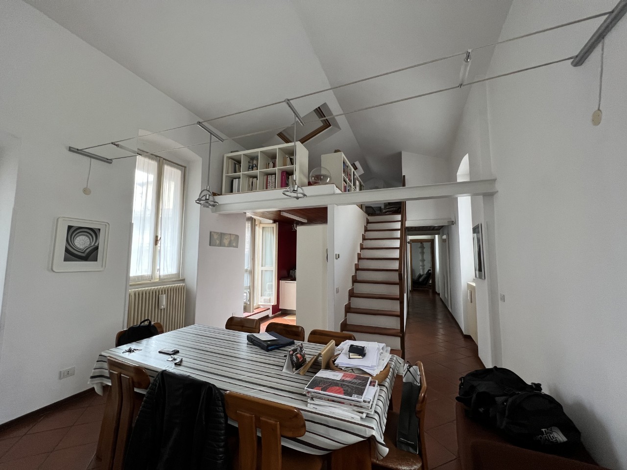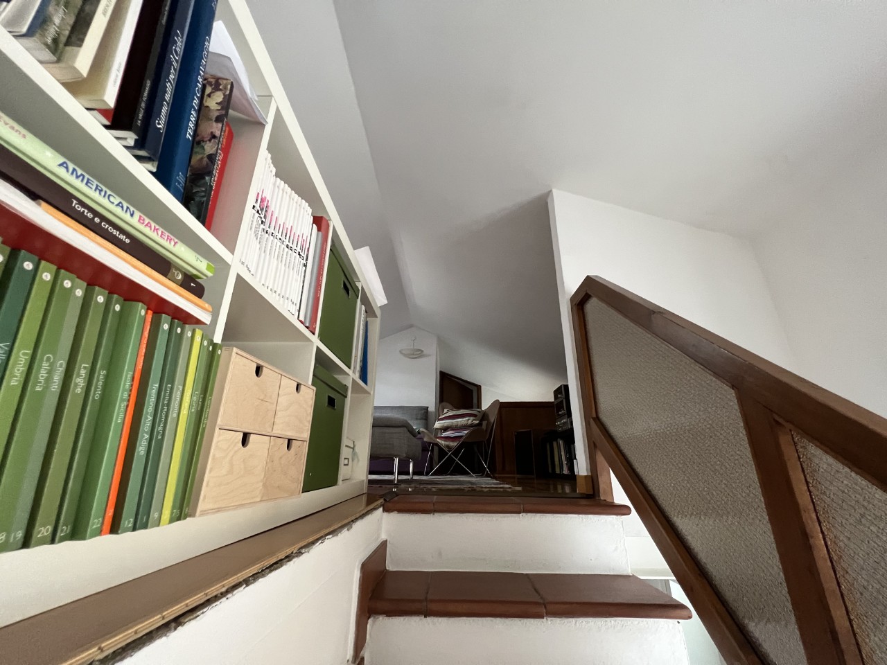 ingresso, angolo cottura con ampia zona pranzo e sul soppalco soggiorno con ripostiglio, camera matrimoniale, camera singola, bagno finestrato con doccia, balcone. Mq. 90