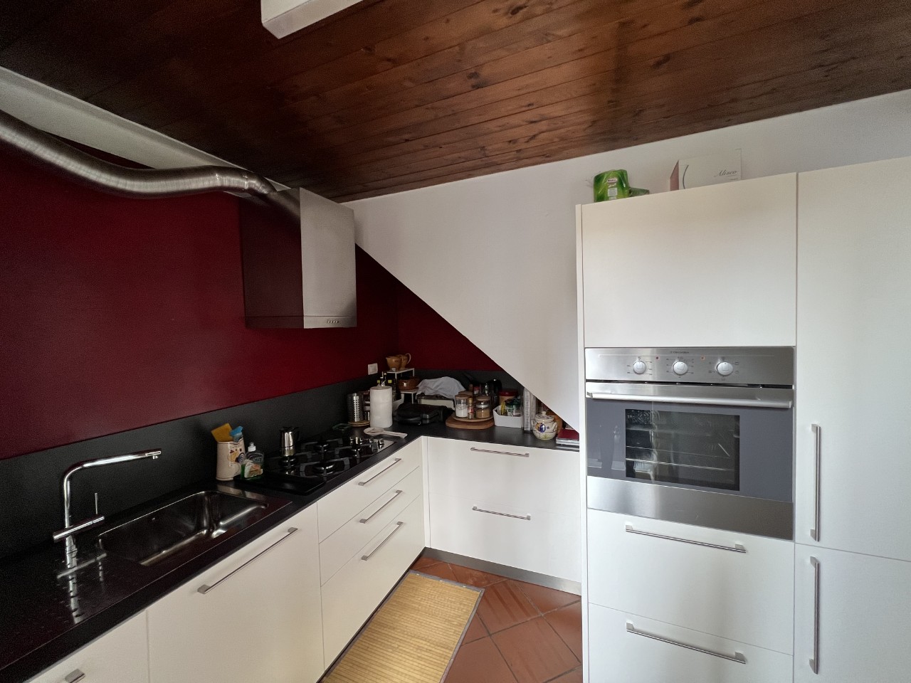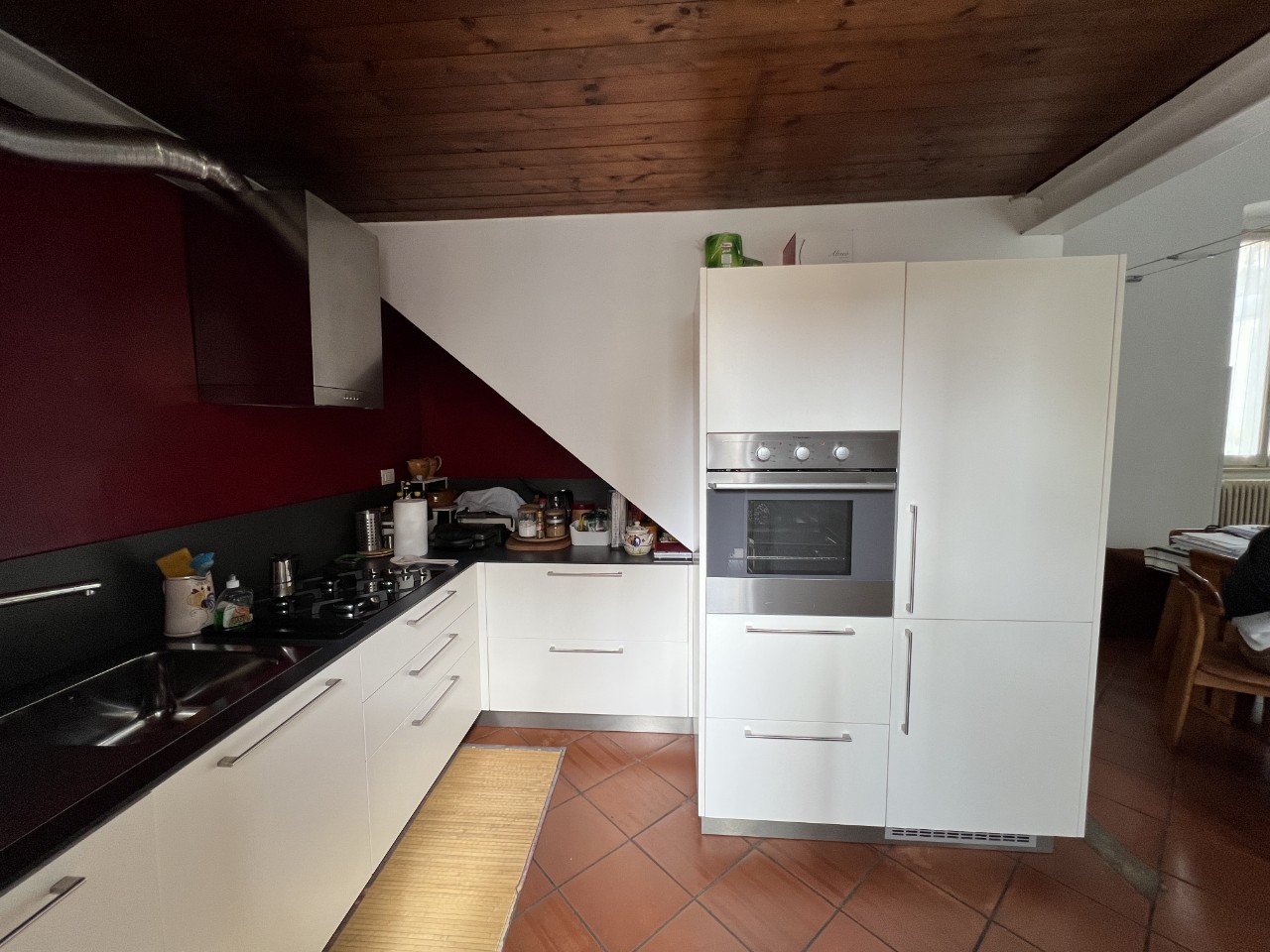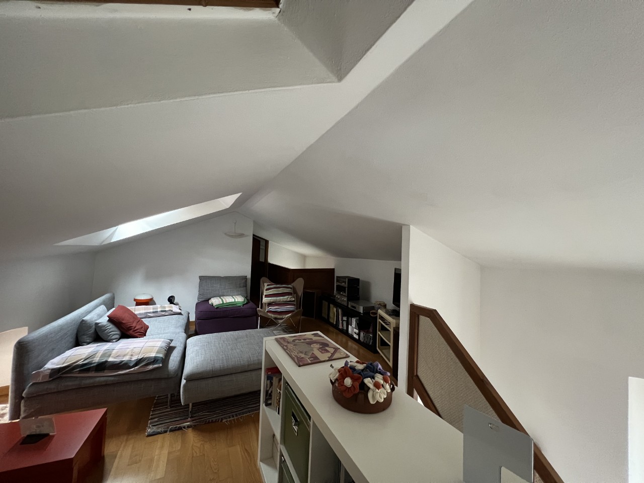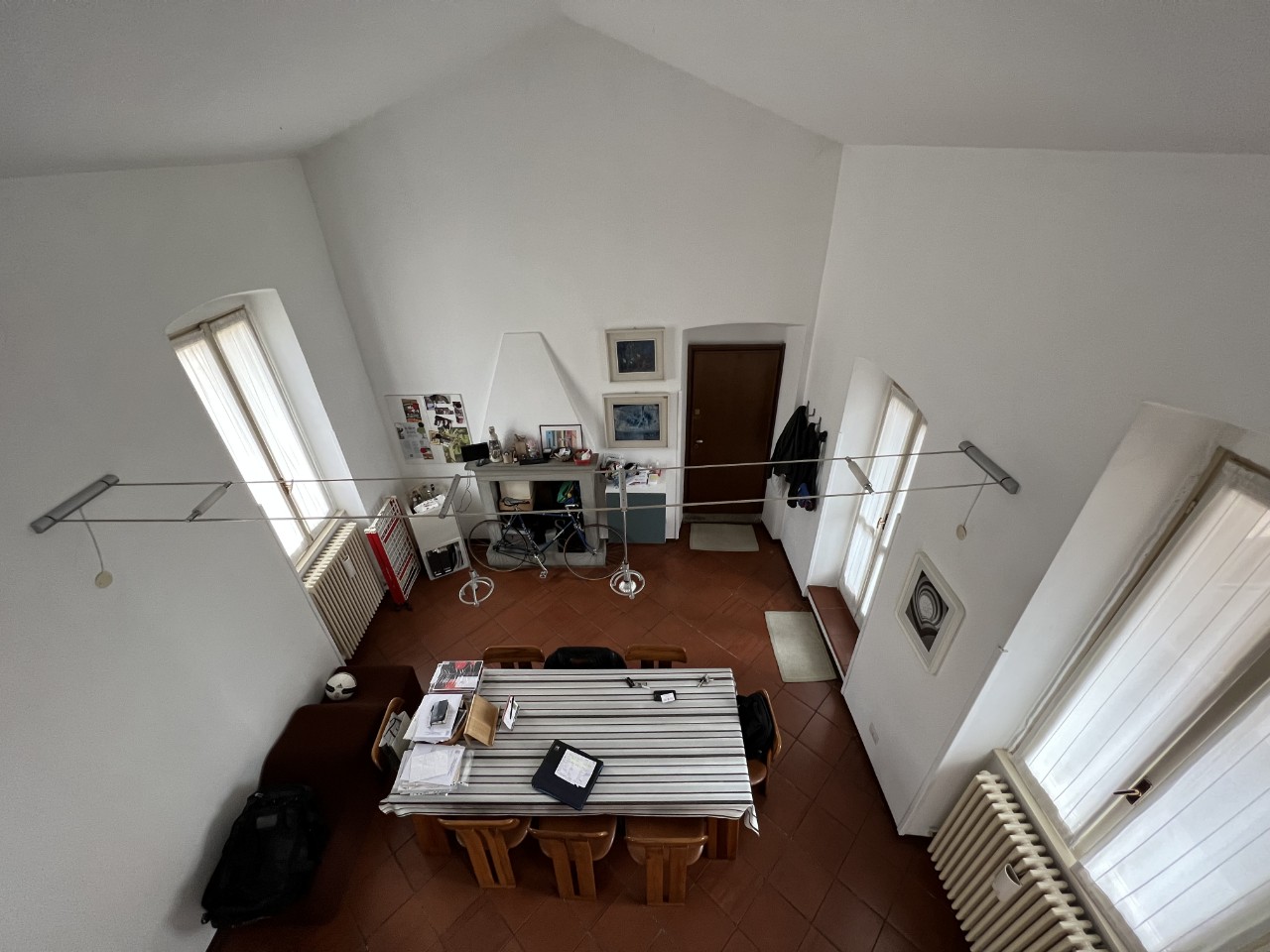 ingresso, angolo cottura con ampia zona pranzo e sul soppalco soggiorno con ripostiglio, camera matrimoniale, camera singola, bagno finestrato con doccia, balcone. Mq. 90