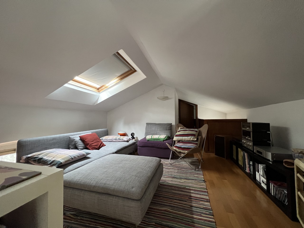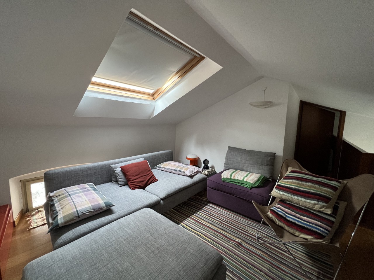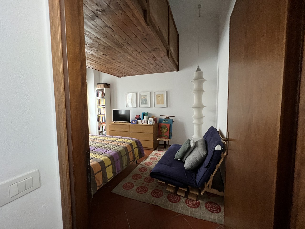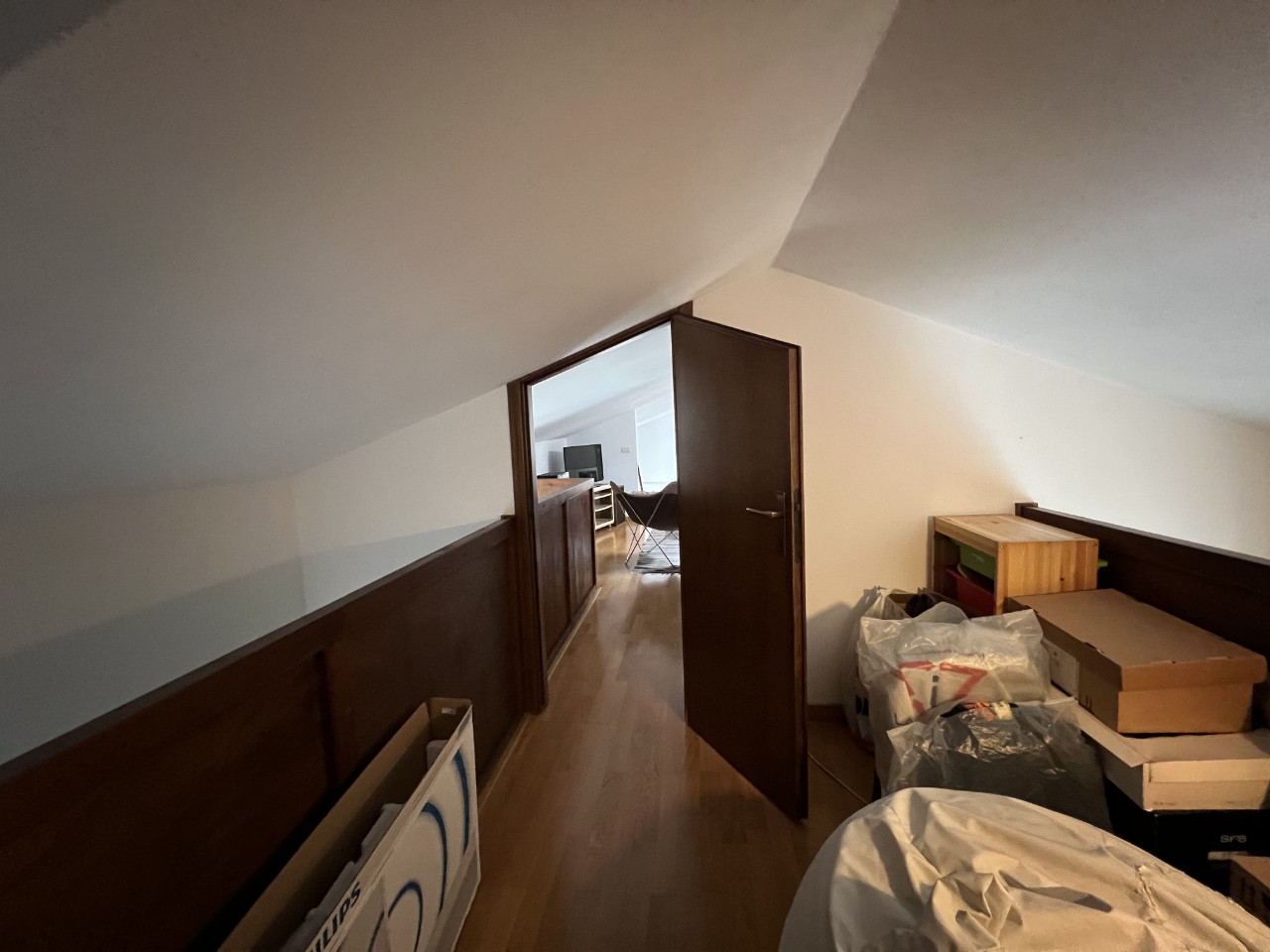 ingresso, angolo cottura con ampia zona pranzo e sul soppalco soggiorno con ripostiglio, camera matrimoniale, camera singola, bagno finestrato con doccia, balcone. Mq. 90
