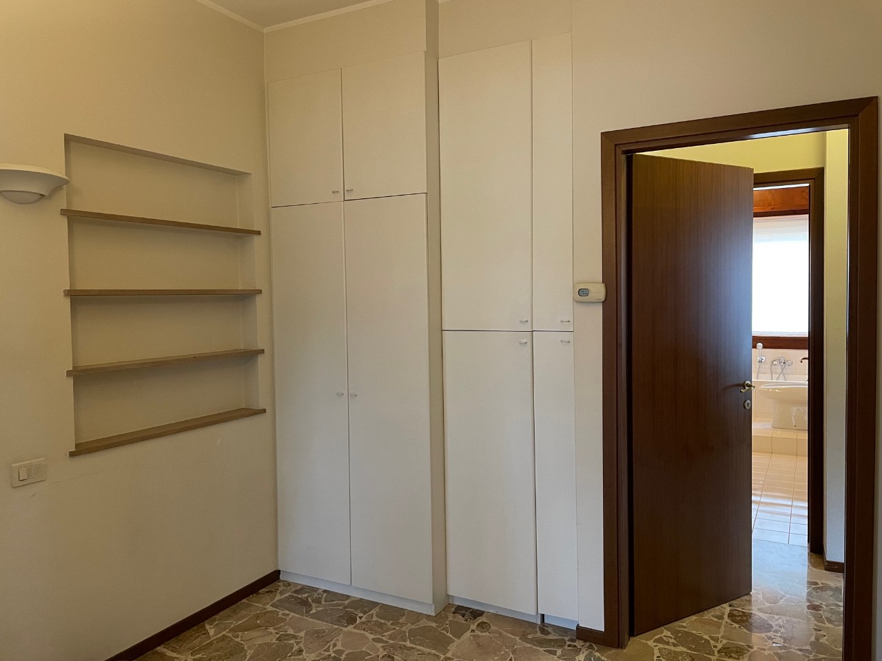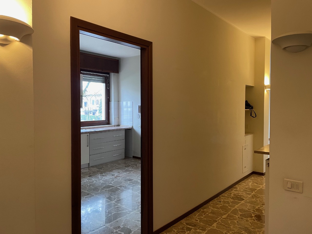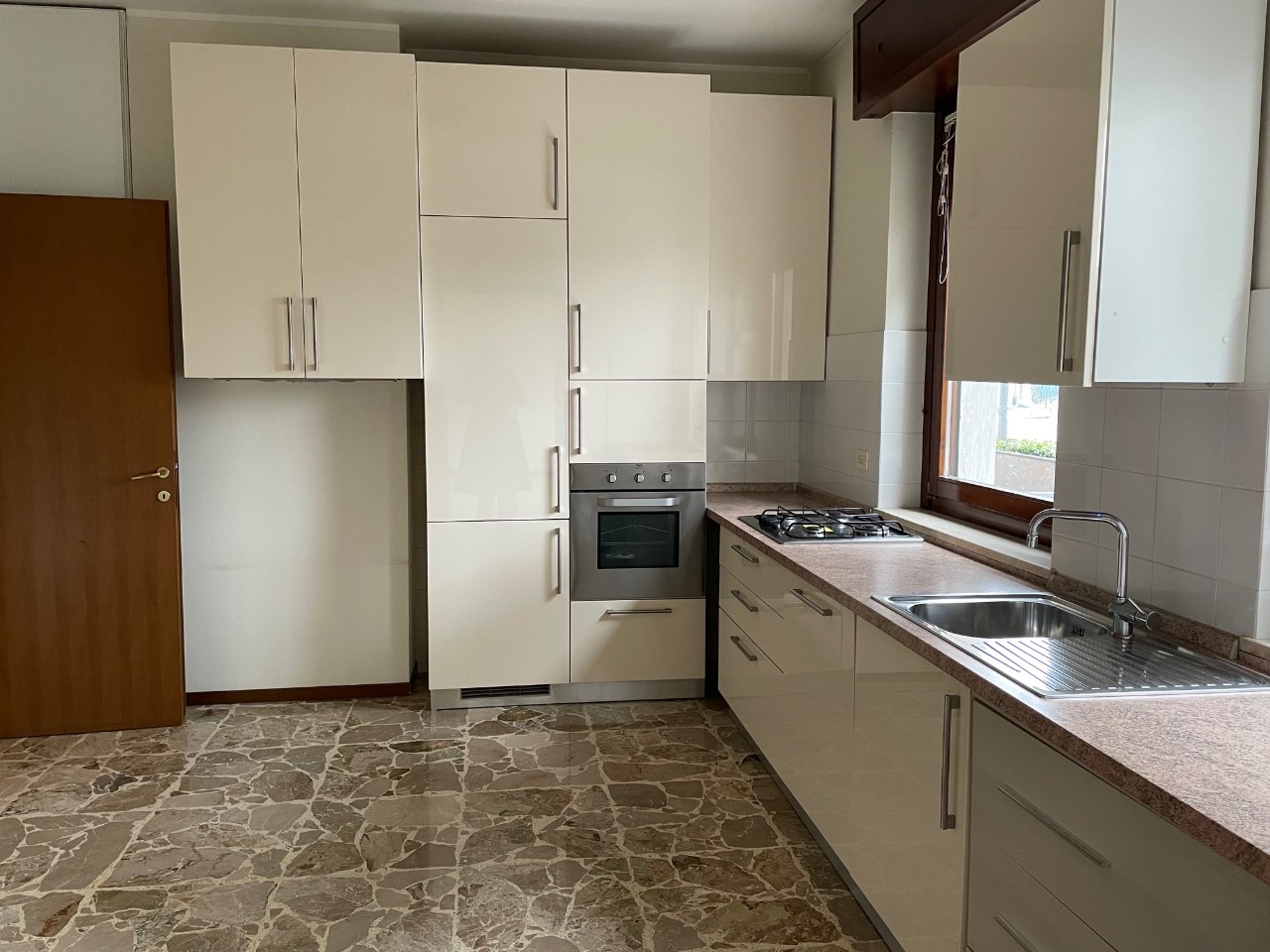 ingresso con armadiature su misura, soggiorno, cucina abitabile ARREDATA, 3 camere (di cui una attrezzata come cabina armadio), due bagni finestrati, 2 balconi. Mq. 120