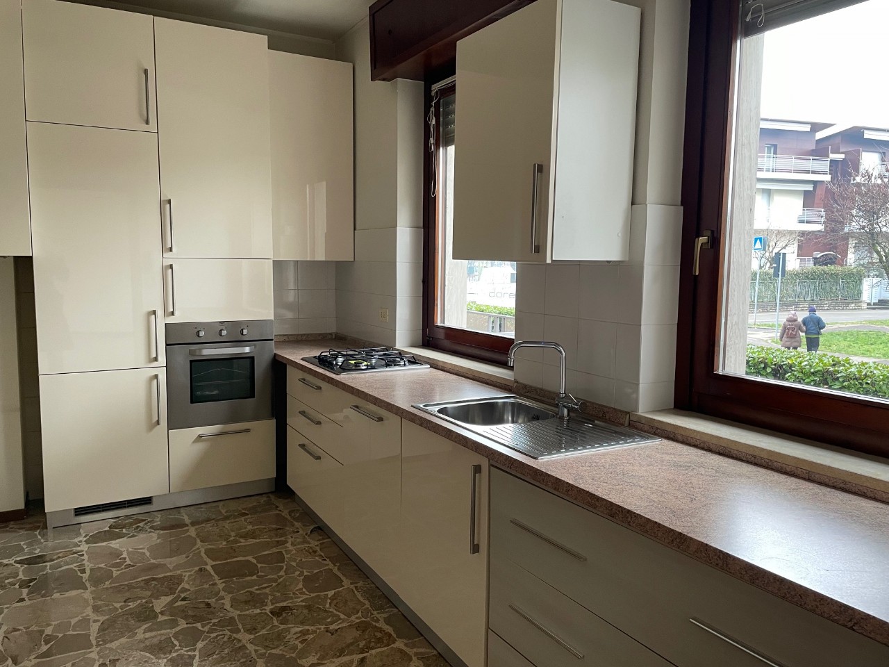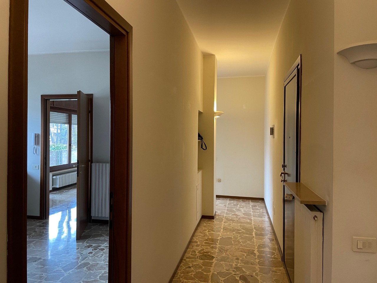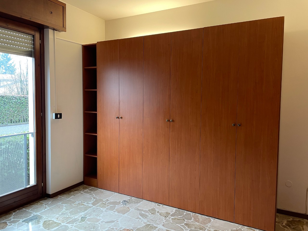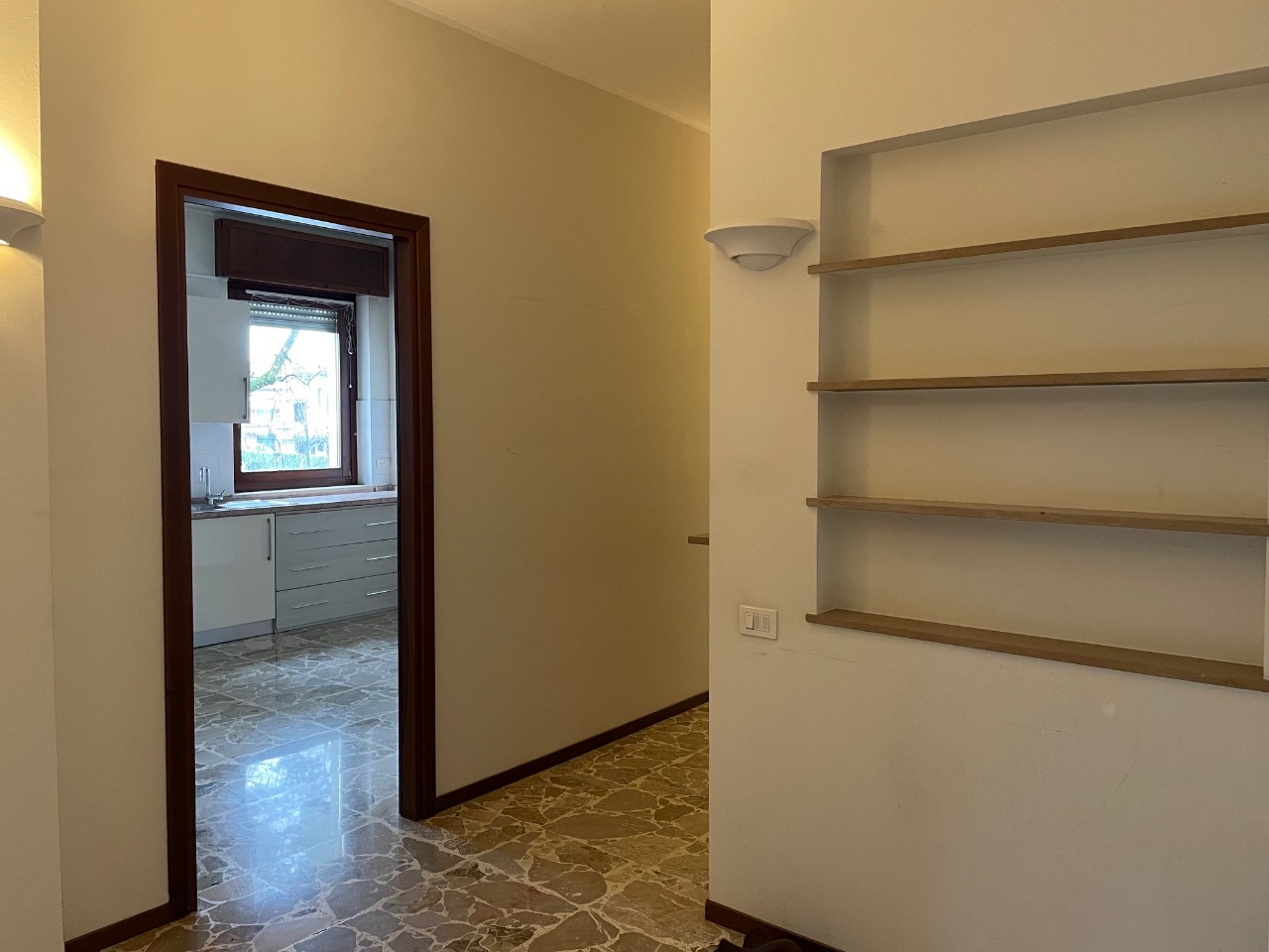 ingresso con armadiature su misura, soggiorno, cucina abitabile ARREDATA, 3 camere (di cui una attrezzata come cabina armadio), due bagni finestrati, 2 balconi. Mq. 120