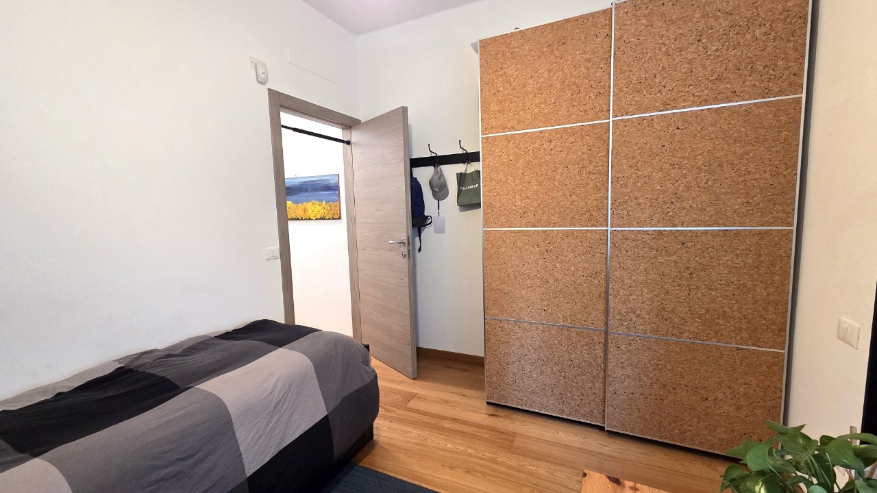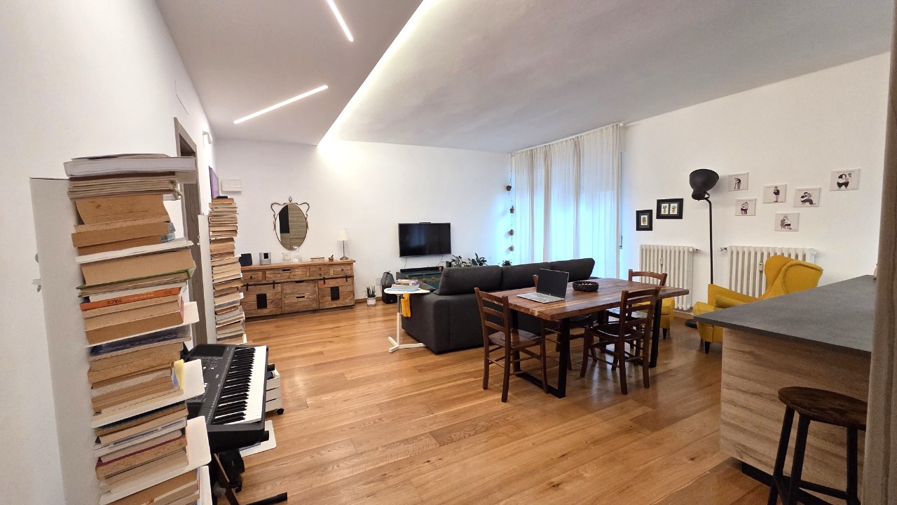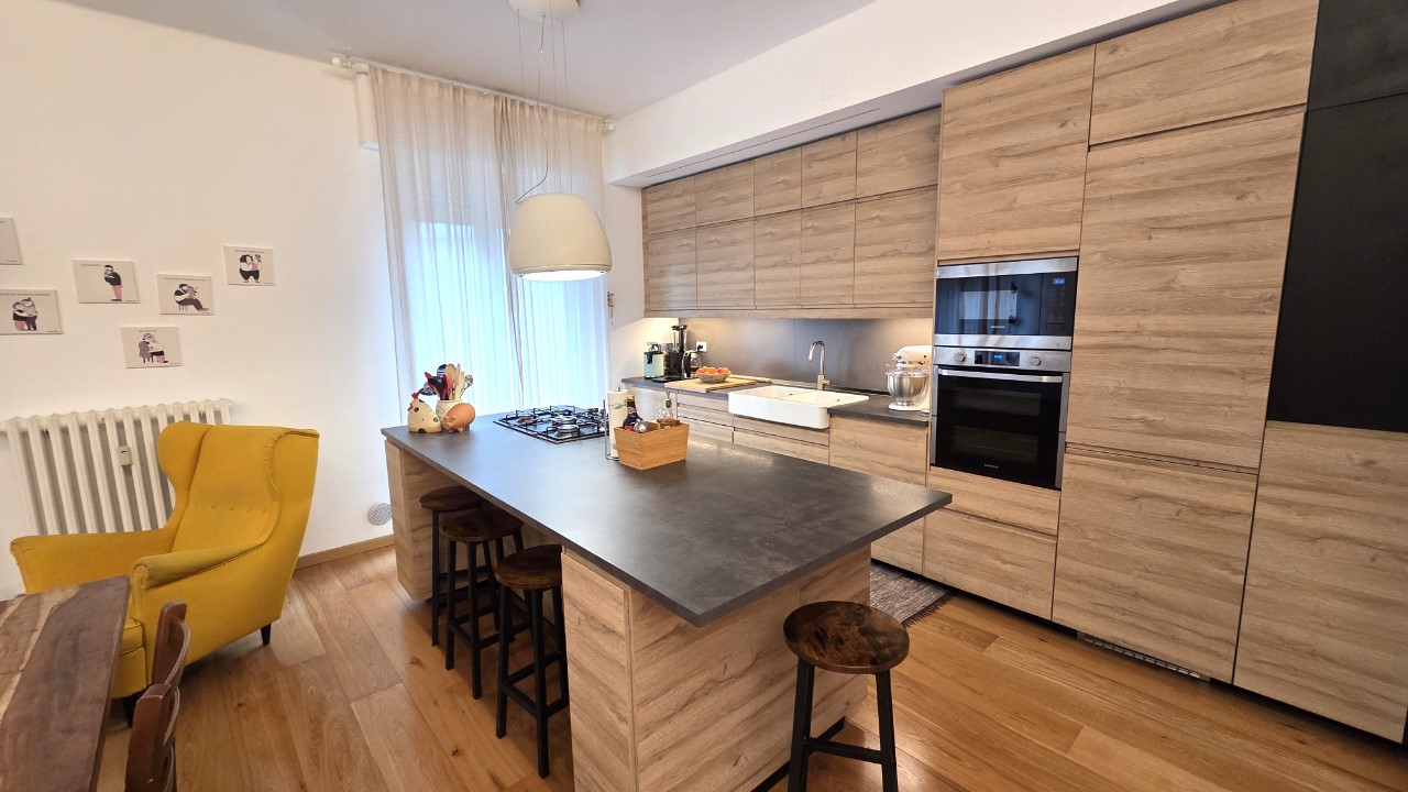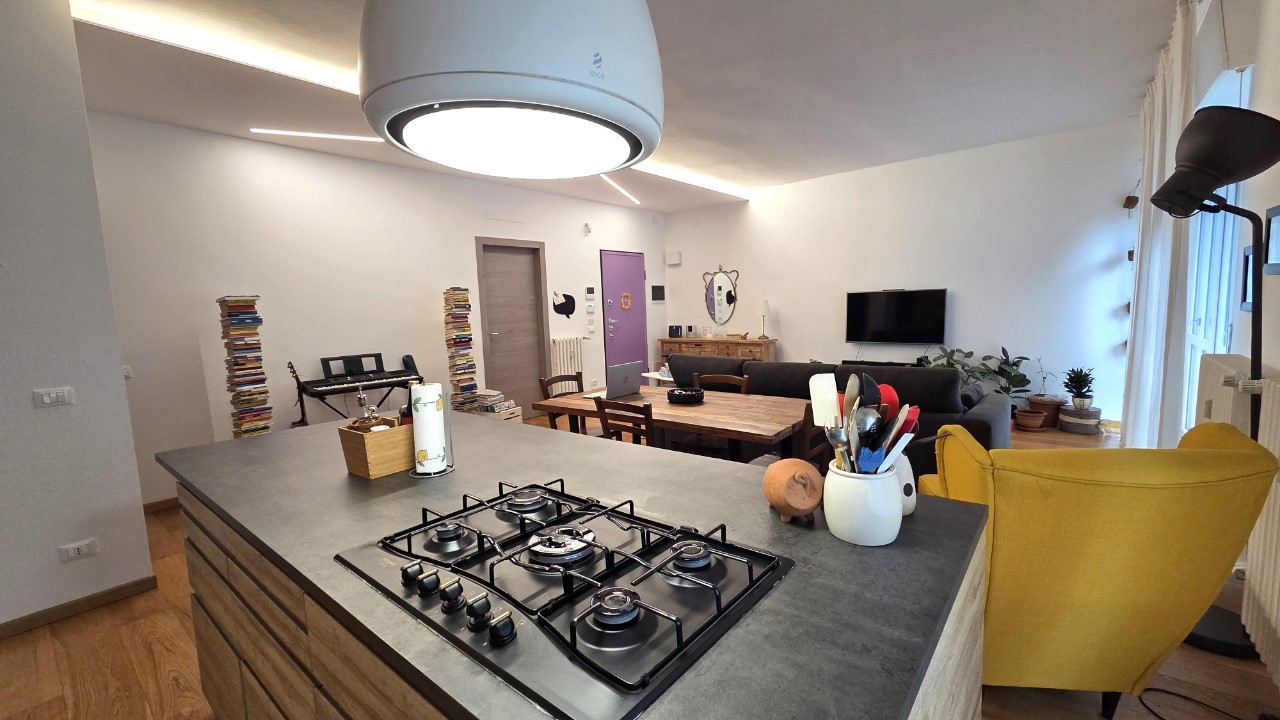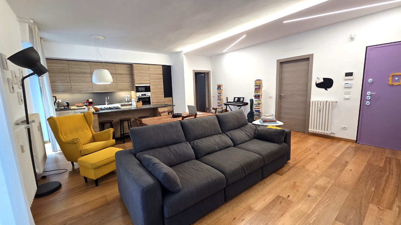 L’ingresso conduce a un luminoso soggiorno con cucina a vista, ambiente accogliente e contemporaneo, ideale per la vita quotidiana e per ricevere ospiti.