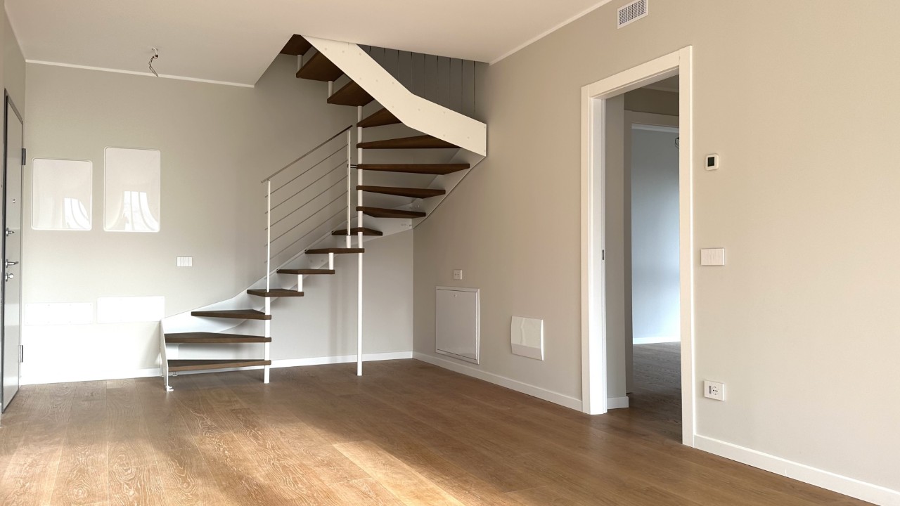 La soluzione è dotata di riscaldamento e raffrescamento a pavimento, sistema di ventilazione meccanica controllata (VMC), predisposizione per l’impianto di allarme, infissi in PVC ad alta efficienza, piano cottura a induzione, tapparelle motorizzate, videocitofono e pavimentazione in parquet.
