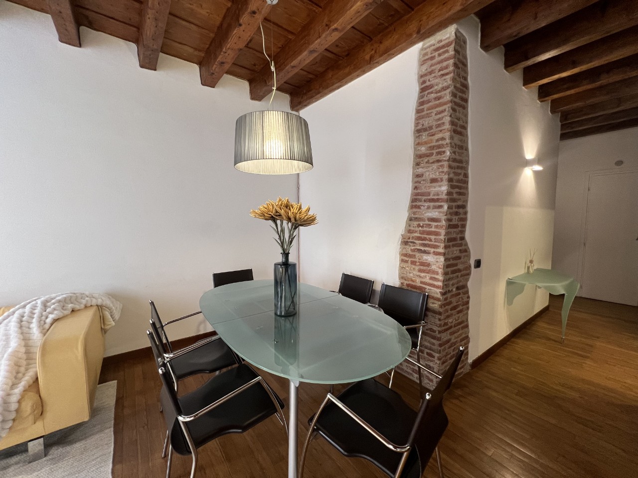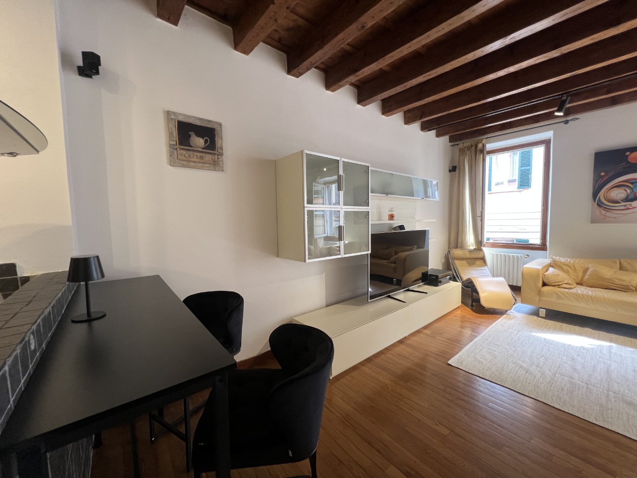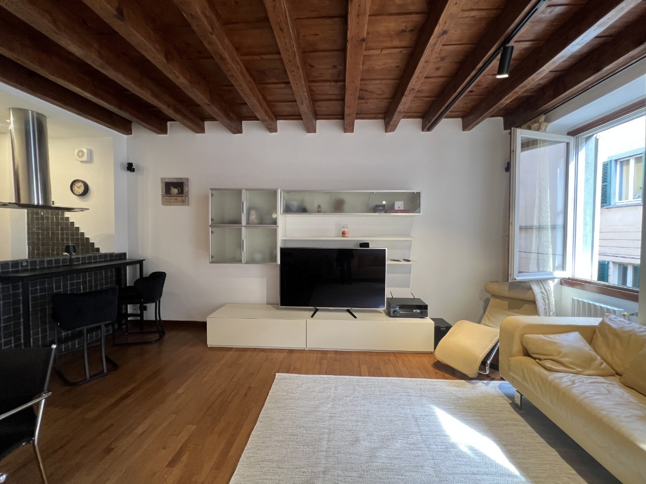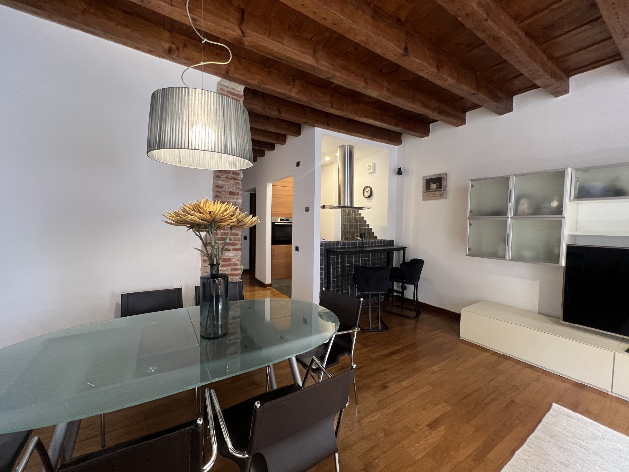 Gli ambienti sono impreziositi da caratteristiche travi in legno a vista che donano calore all’intero appartamento.