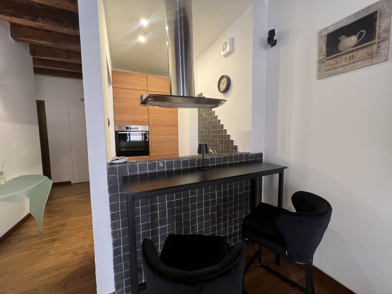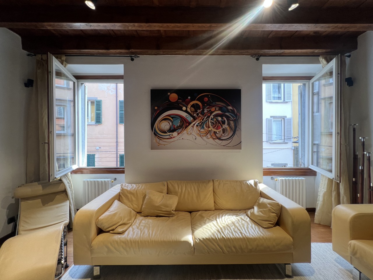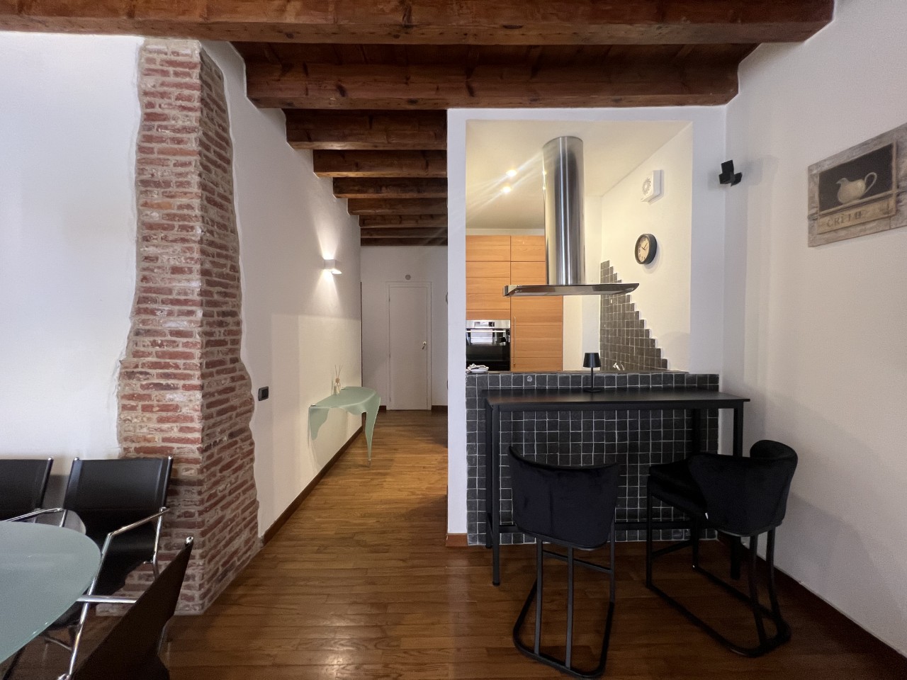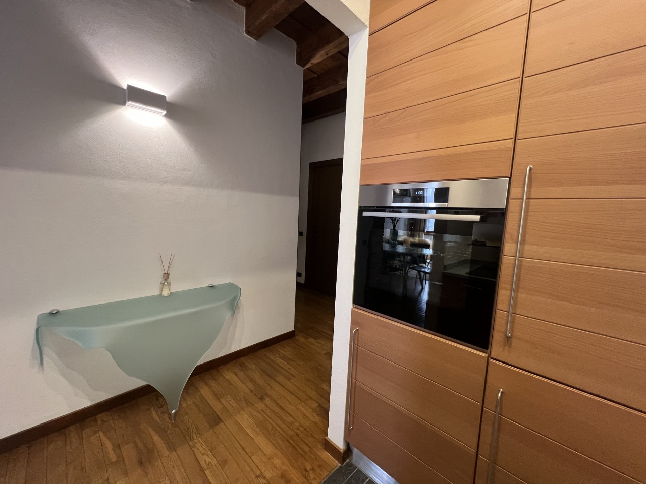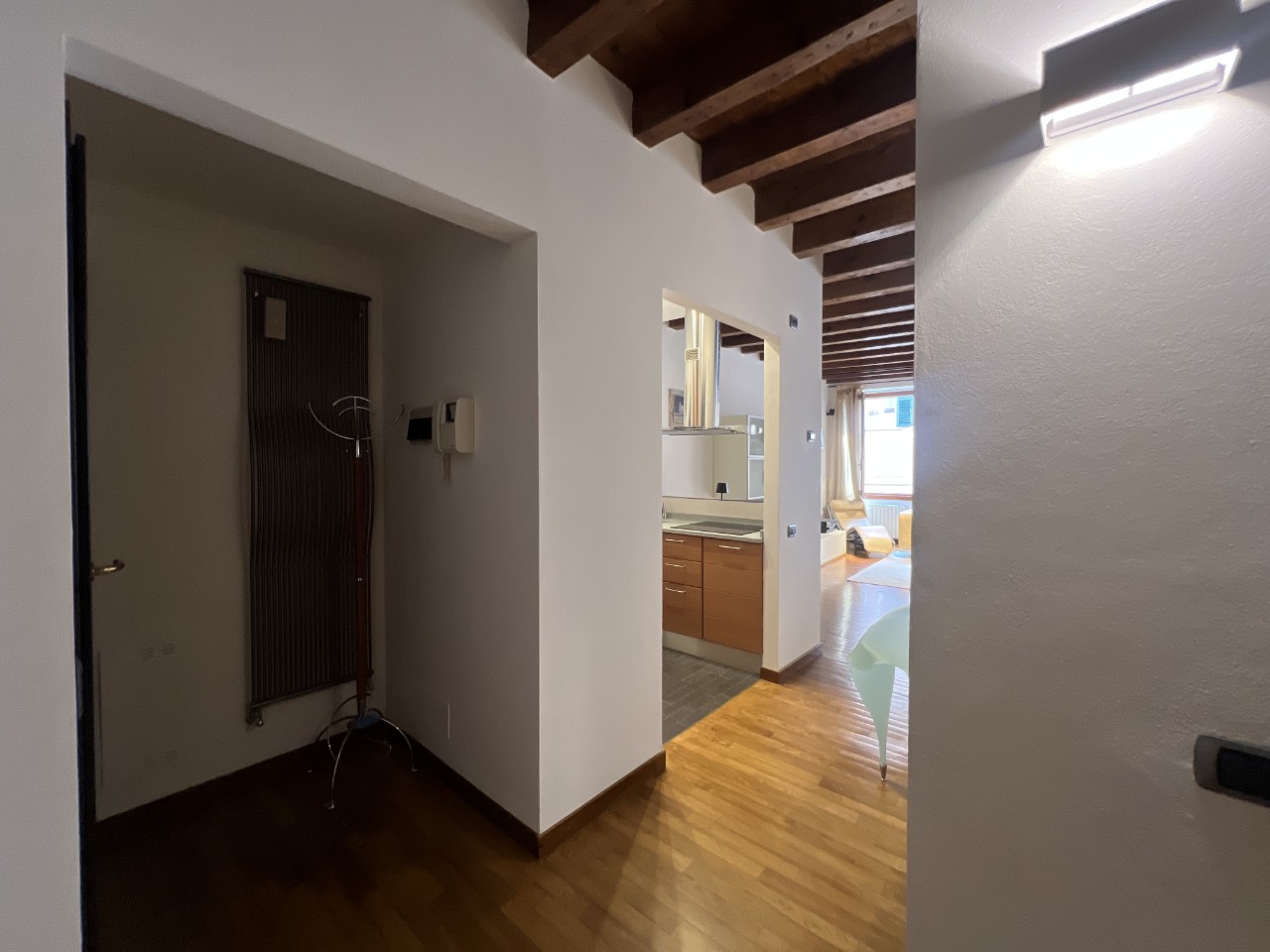 Gli ambienti sono impreziositi da caratteristiche travi in legno a vista che donano calore all’intero appartamento.