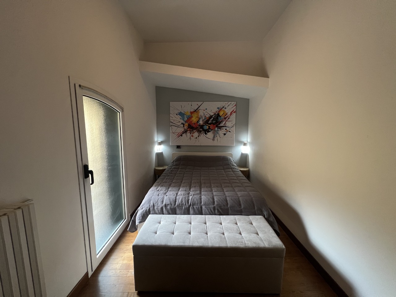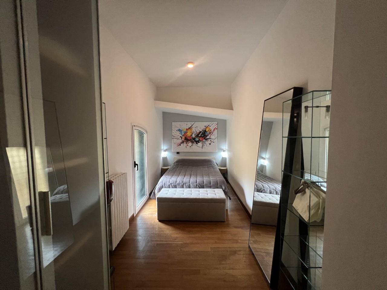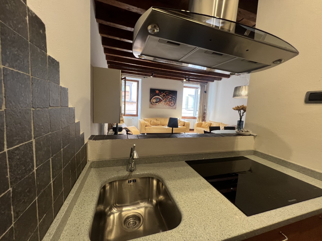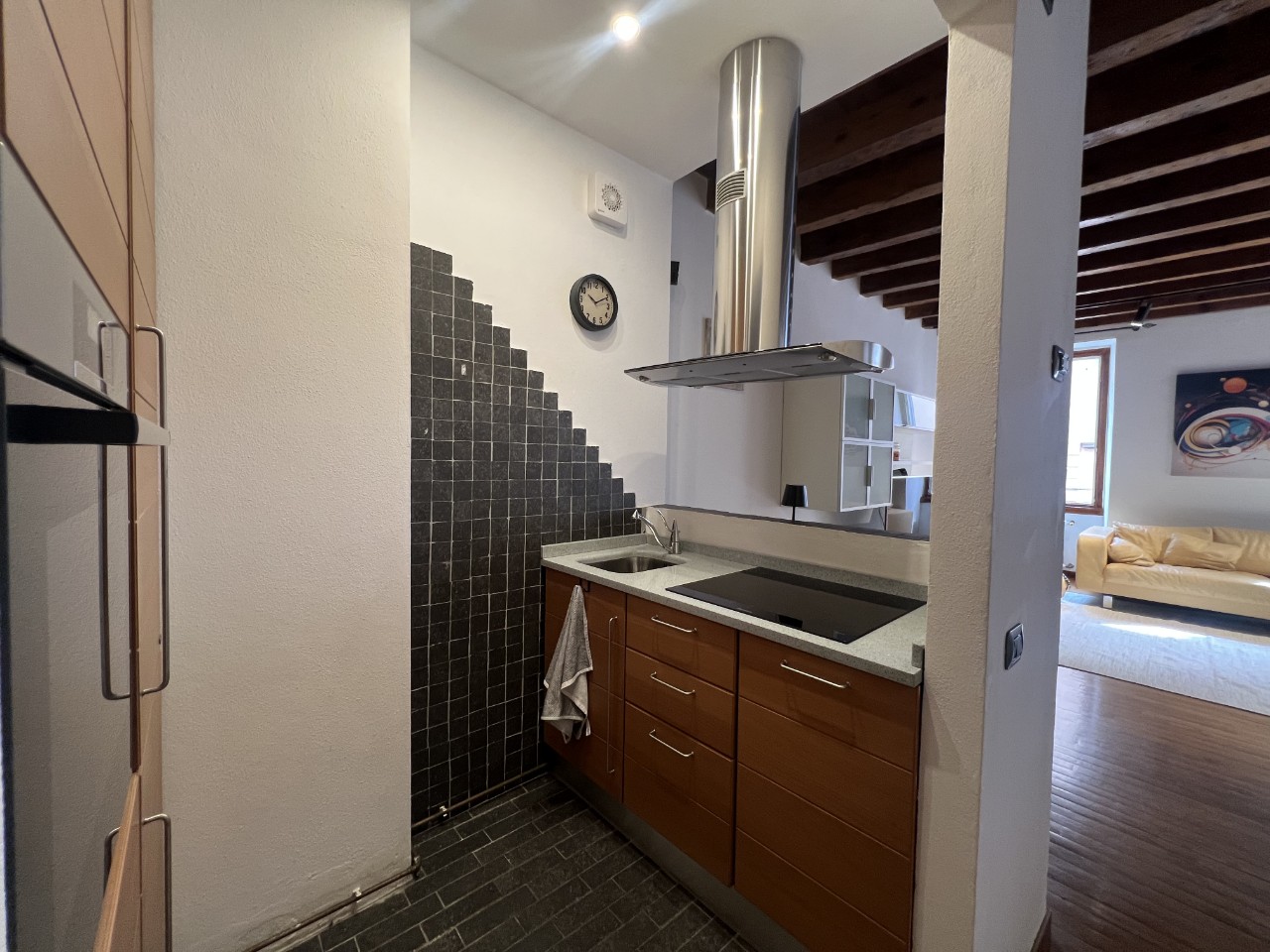Gli ambienti sono impreziositi da caratteristiche travi in legno a vista che donano calore all’intero appartamento.