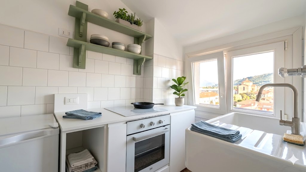 La soluzione posta al 5° piano è composta da: ingresso, soggiorno, cucinotto, bagno finestrato e ampia camera matrimoniale. Mq. 45.