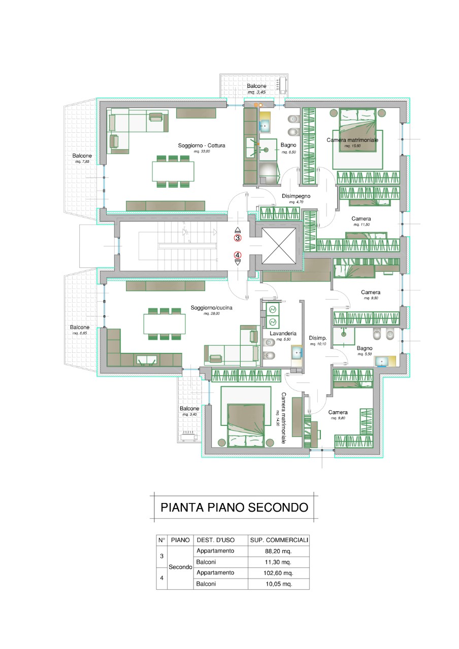 Piano Secondo: soggiorno con parete cottura, tre camere, un bagno, una lavanderia e due balconi = Mq 112.63