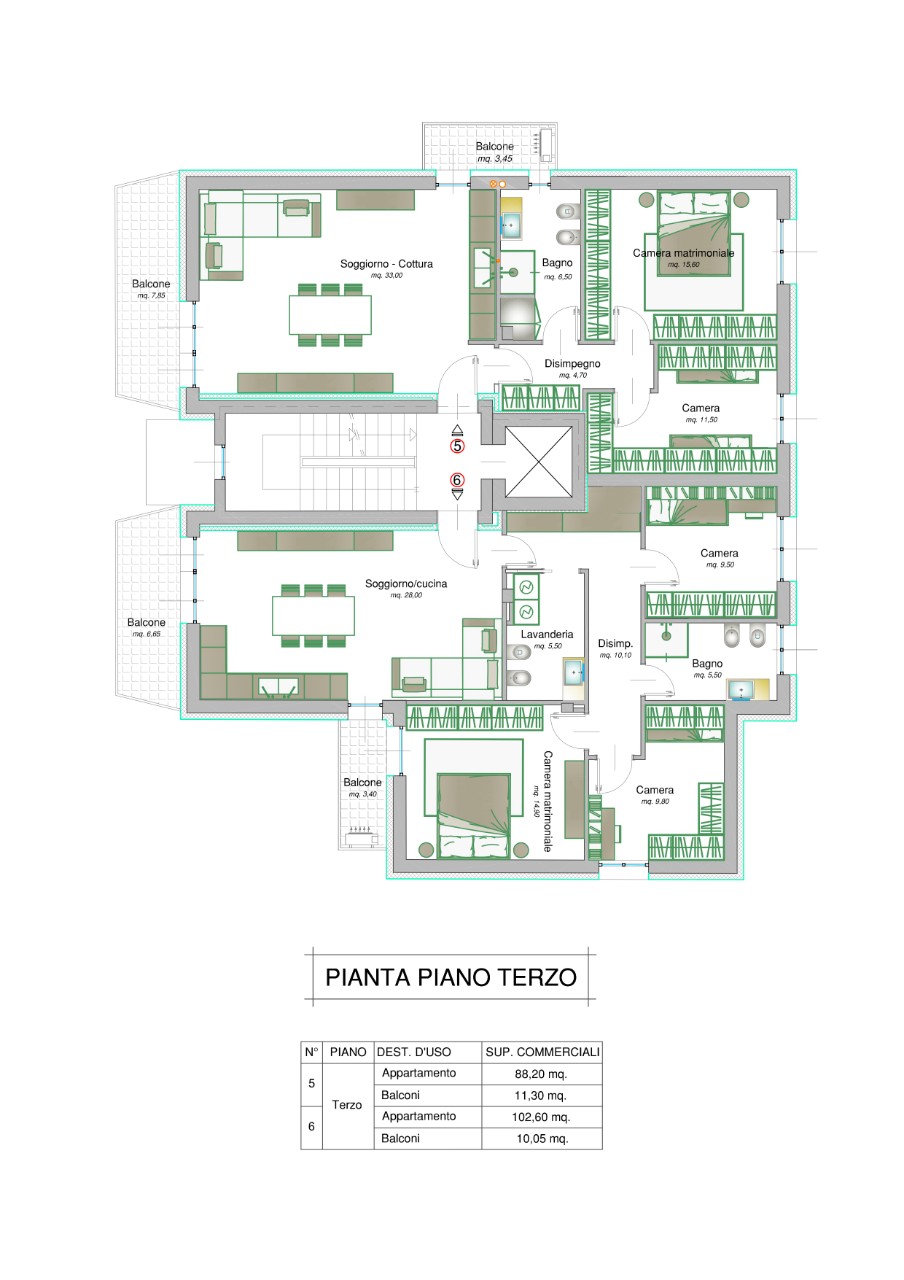 Piano terzo ed ultimo: soggiorno con parete cottura, tre camere, un bagno, una lavanderia e due balconi = Mq. 112,65